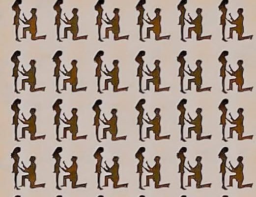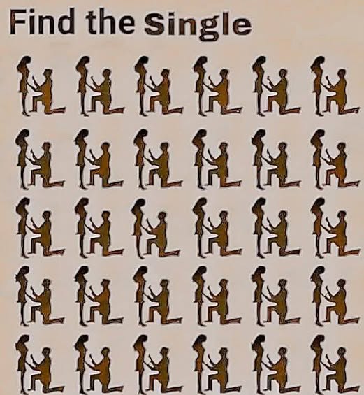 At first glance, the picture shows multiple identical illustrations of a man kneeling before a woman, as if in a proposal or intimate gesture. The task, however, is to spot the one unique figure — the “single” — hidden among the repeated pairs.